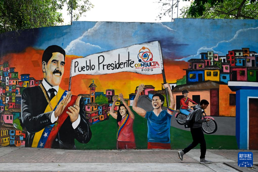 12月2日,在委内瑞拉首都加拉加斯,行人从支持委内瑞拉总统马杜罗的涂鸦墙前走过