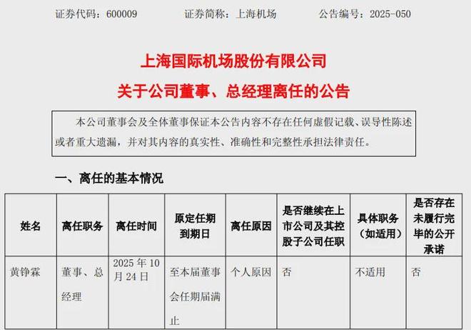 一个月前的10月24日晚,上海机场发布公告,宣布公司总经理黄铮霖因个人原因辞去所有职务,包括董事、董事会专门委员会委员及总经理职务。辞职后,黄铮霖将不再于公司及控股子公司担任任何职务。同时,公司已任命现任副总经理李政佳代为履行总经理职责。