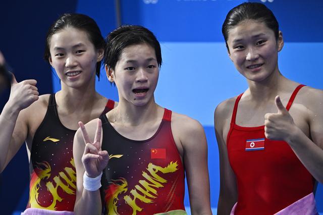 2024年8月6日,冠军中国选手全红婵(中)、亚军中国选手陈芋汐(左)、季军朝鲜选手金姬燕在比赛后合影 新华社记者 王鹏 摄