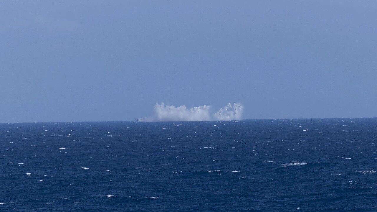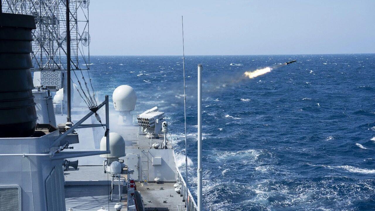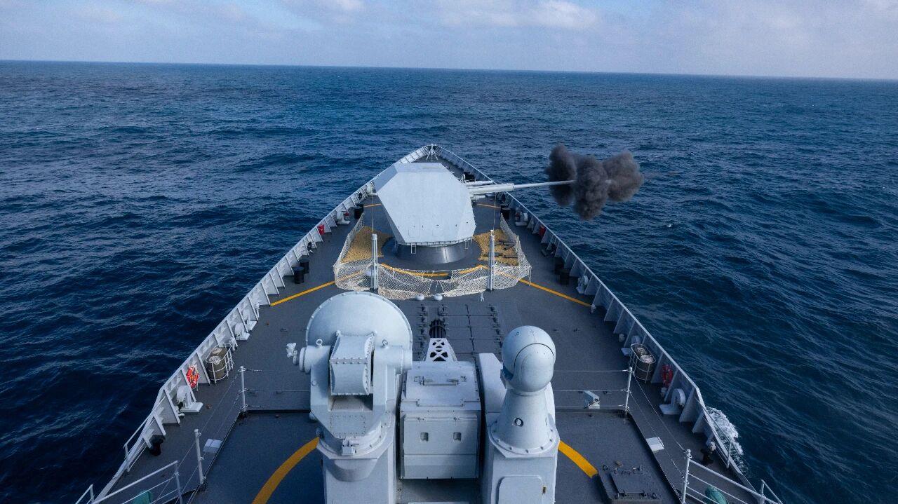 训练中,随着指挥员一声令下,编队率先实施对海打击演练。主炮昂首怒吼,炮弹呼啸出膛,精准命中预定海上目标,充分检验了火力系统的快速反应和精确打击能力。
