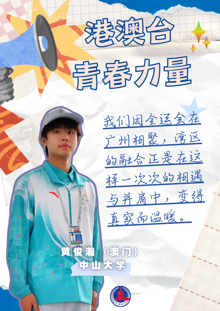 第十五届全国运动会正在粤港澳三地如火如荼举行 盛大的开幕式与精彩的竞赛背后 一群身着“碧青绿”的“小海豚” 穿梭于观众、运动员等赛会相关人员之间 用温暖的语言、灿烂的微笑与专业的服务 为赛会增光添彩 他们正是十五运会和残特奥会的志愿者 在这些志愿者中 来自港澳台的“小海豚们” 以热情和专业为全运会贡献青春力量 一起听听他们的心声 十五运会的赛事还在火热进行中 港澳台青年志愿者的身影将继续闪耀赛场内外 他们用服务绘就“同心圆” 用青春共筑中国梦 记者:朱娜 邓瑞璇 毛鑫 新华社对外部 广东分社 联合制作