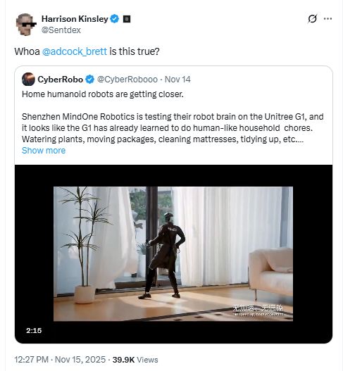 这家成立不久的公司背景也不简单,创始人来自腾讯。他们使用的硬件,是另一家中国公司宇树科技(Unitree)的G1人形机器人。