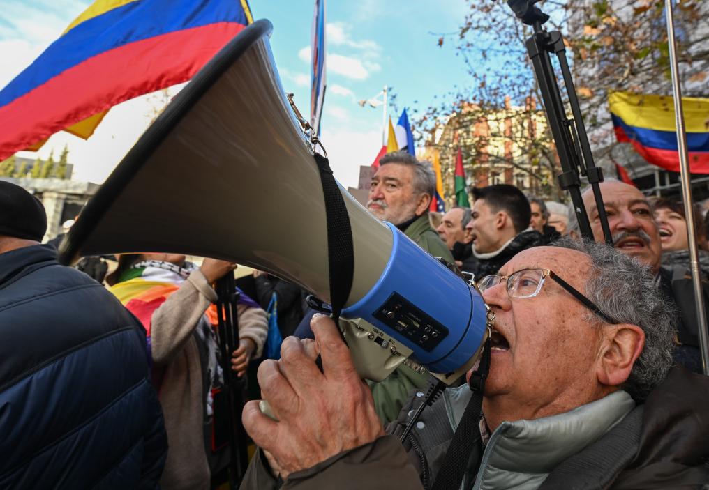 2026年1月4日,民众在西班牙马德里市中心的美国驻西班牙大使馆前,抗议美国对委内瑞拉采取军事行动。新华社记者程敏摄