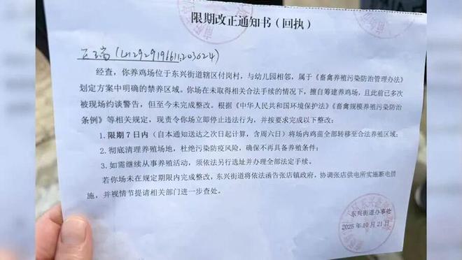 经调查,该养鸡场位于禁养区,且未取得任何合法手续。10月21日,东兴街道办事处向养鸡场下发限期整改通知书,要求在7日内将鸡苗转移并彻底清理场地,否则将依法采取断电等措施。然而,整改通知下发后养鸡场仍未停止养殖。