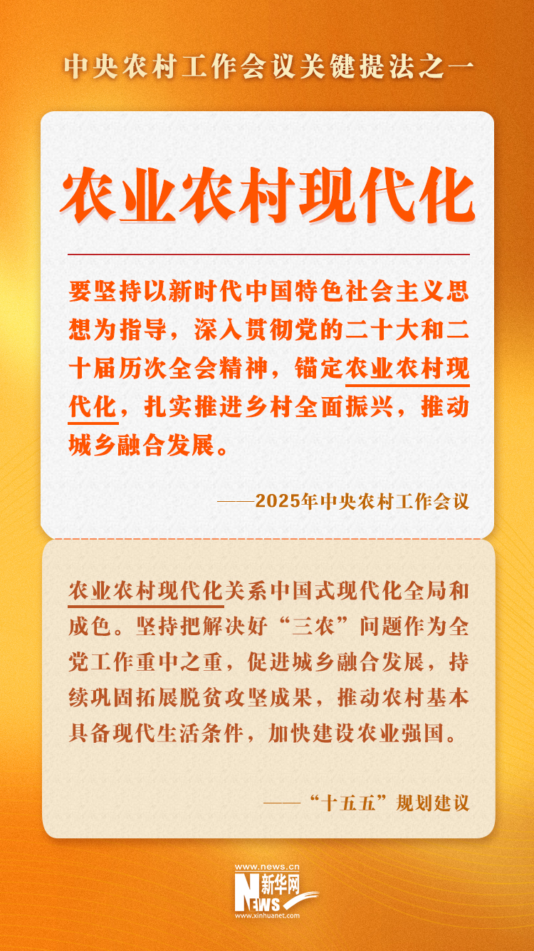 近日召开的中央农村工作会议,系统分析了当前“三农”工作面临的形势和挑战,并对2026年农业农村工作作出全面部署。会议强调,农业农村现代化事关中国式现代化全局和成色,是全面建设社会主义现代化国家必须夯实的重要基础。为帮助公众更好理解会议精神,新华网对会议提出的部分关键提法进行了梳理解读。