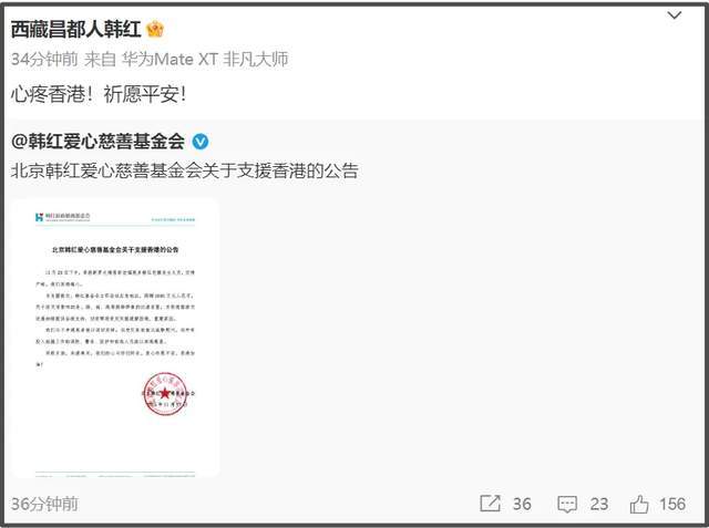 韩红本人也是第一时间转发基金会捐款公告,留下一句:“心疼香港!祈愿平安”————韩红基金捐出的一千万汇集多方力量,希望能帮助到更多人吧。